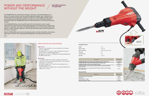The TE 2000-AVR is the perfect blend of power, ergonomics, and weight. Weighing in at 33 lbs., it is easy to maneuver and transport throughout the jobsite, and is ready for use in minutes thanks to the detachable cord and quick TE S-connection. With a t-handle design and exceptionally low vibration from Hilti’ s innovative sub-chassis AVR( Active Vibration Reduction) system, the TE 2000-AVR allows for efficient performance and maximum working comfort.