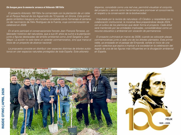 El proyecto Arboreto 100 Félix ha comenzado con la plantación de un roble en el Parque Natural de los Aiguamolls de l’ Empordà, en Girona. Este primer gesto simbólico inaugura una iniciativa concebida como homenaje al centenario del nacimiento de Félix Rodríguez de la Fuente, cuya conmemoración se celebrará en 2028.