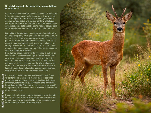 La confirmación de la reproducción del corzo morisco por tercer año consecutivo en la laguna de la Huerta de las Pilas, en Algeciras, refuerza el valor ecológico de este enclave surgido sobre una antigua cantera. El hallazgo, documentado mediante cámaras nocturnas, evidencia la consolidación de este espacio como hábitat estable para fauna salvaje en un entorno cercano al núcleo urbano.