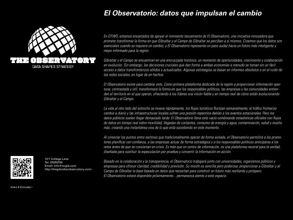 En OTWO, estamos encantados de apoyar el inminente lanzamiento de El Observatorio, una iniciativa innovadora que promete transformar la forma en que Gibraltar y el Campo de Gibraltar se perciben a sí mismos. Creemos que los datos son esenciales cuando se requiere un cambio, y El Observatorio representa un paso audaz hacia un futuro más inteligente y mejor informado para la región.