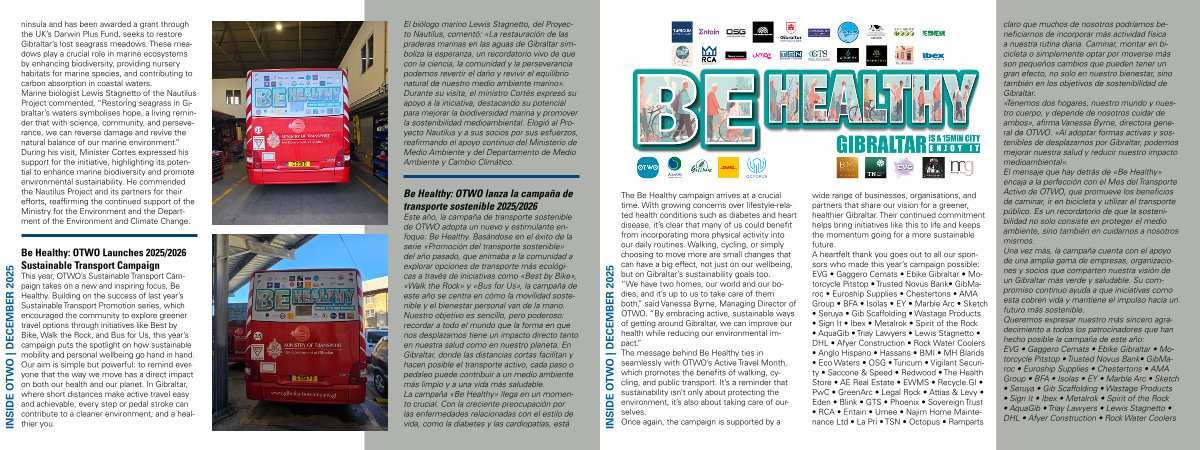 claro que muchos de nosotros podríamos beneficiarnos de incorporar más actividad física a nuestra rutina diaria. Caminar, montar en bicicleta o simplemente optar por moverse más son pequeños cambios que pueden tener un gran efecto, no solo en nuestro bienestar, sino también en los objetivos de sostenibilidad de Gibraltar. « Tenemos dos hogares, nuestro mundo y nuestro cuerpo, y depende de nosotros cuidar de ambos », afirma Vanessa Byrne, directora general de OTWO. « Al adoptar formas activas y sostenibles de desplazarnos por Gibraltar, podemos mejorar nuestra salud y reducir nuestro impacto medioambiental ». El mensaje que hay detrás de « Be Healthy » encaja a la perfección con el Mes del Transporte Activo de OTWO, que promueve los beneficios de caminar, ir en bicicleta y utilizar el transporte público. Es un recordatorio de que la sostenibilidad no solo consiste en proteger el medio ambiente, sino también en cuidarnos a nosotros mismos. Una vez más, la campaña cuenta con el apoyo de una amplia gama de empresas, organizaciones y socios que comparten nuestra visión de un Gibraltar más verde y saludable. Su compromiso continuo ayuda a que iniciativas como esta cobren vida y mantiene el impulso hacia un futuro más sostenible. Queremos expresar nuestro más sincero agradecimiento a todos los patrocinadores que han hecho posible la campaña de este año: EVG • Gaggero Cemats • Ebike Gibraltar • Motorcycle Pitstop • Trusted Novus Bank • GibMaroc • Euroship Supplies • Chestertons • AMA Group • BFA • Isolas • EY • Marble Arc • Sketch