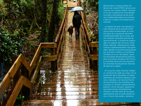 La edición de este mes destaca lo más relevante de la reciente conferencia sobre biodiversidad, el increíble logro de un grupo de activistas medioambientales de La Línea, que han recibido merecidos premios de reconocimiento, y muestra la creatividad y el impacto del concurso Urban Oasis. Además, reflexionamos sobre noticias medioambientales más generales, desde la creciente preocupación por la erosión costera y la resiliencia climática en el sur de España, hasta los renovados llamamientos políticos para una acción climática más firme y el cauteloso alivio que han supuesto las recientes lluvias para las reservas de agua de la región.