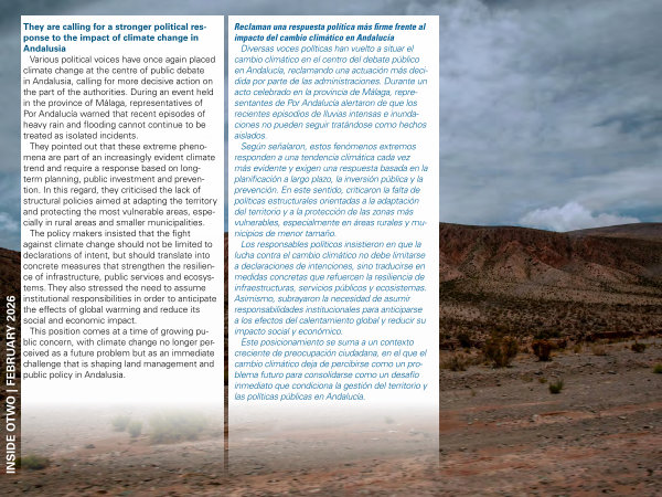 They are calling for a stronger political response to the impact of climate change in Andalusia Various political voices have once again placed climate change at the centre of public debate in Andalusia, calling for more decisive action on the part of the authorities. During an event held in the province of Málaga, representatives of Por Andalucía warned that recent episodes of heavy rain and flooding cannot continue to be treated as isolated incidents. They pointed out that these extreme phenomena are part of an increasingly evident climate trend and require a response based on longterm planning, public investment and prevention. In this regard, they criticised the lack of structural policies aimed at adapting the territory and protecting the most vulnerable areas, especially in rural areas and smaller municipalities. The policy makers insisted that the fight against climate change should not be limited to declarations of intent, but should translate into concrete measures that strengthen the resilience of infrastructure, public services and ecosystems. They also stressed the need to assume institutional responsibilities in order to anticipate the effects of global warming and reduce its social and economic impact. This position comes at a time of growing public concern, with climate change no longer perceived as a future problem but as an immediate challenge that is shaping land management and public policy in Andalusia.