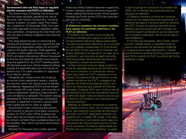 Government sets out first steps to regulate electric scooters and PLETs in Gibraltar The Government of Gibraltar has announced the first steps towards regulating the use of Personal Light Electric Transporters, including electric scooters, on public roads. The measures, unveiled on 15 December 2025, form part of a wider approach aimed at regulation rather than prohibition, recognising the role these vehicles can play in easing congestion and reducing emissions. The initial phase focuses on enforcing the existing 25 kilometres per hour speed limit and introducing a registration system for all PLETs used on the public highway. Draft legislation will allow mobile speed cameras to be used on PLETs and give enforcement officers the power to remove and impound vehicles found exceeding the speed limit. Any PLET travelling above 25 kilometres per hour will be treated as falling outside the legal definition and will only be released once it is made compliant or registered as an electric vehicle. Alongside this, Government will introduce an annual online registration system, costing ten pounds, which will require proof of identity and address. Registered PLETs will be issued with a visible QR code sticker, with incorrect or missing registration leading to impoundment until compliance is achieved. The system, being developed by Piranha following a competitive process, is expected to launch in spring 2026, with a grace period for users to register. Government is also continuing discussions with insurers to secure a third party insurance product for PLET users. While progress has been slow due to market concerns, the minister remain confident that a suitable product will be available, after which insurance will become mandatory. Minister for Transport John Cortes said the |
