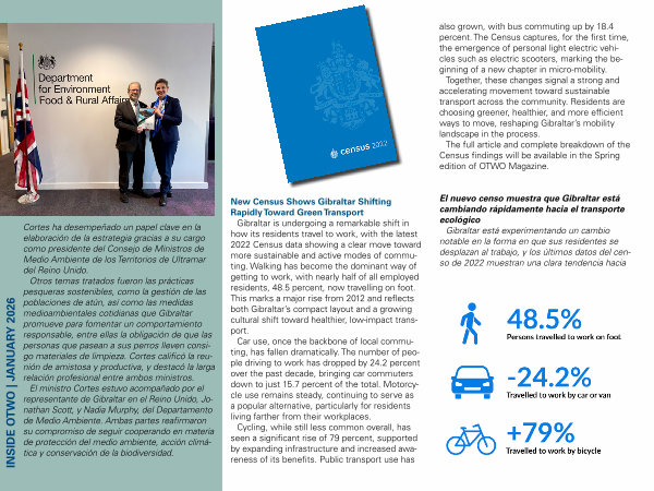 also grown, with bus commuting up by 18.4 percent. The Census captures, for the first time, the emergence of personal light electric vehicles such as electric scooters, marking the beginning of a new chapter in micro-mobility. Together, these changes signal a strong and accelerating movement toward sustainable transport across the community. Residents are choosing greener, healthier, and more efficient ways to move, reshaping Gibraltar’ s mobility landscape in the process. The full article and complete breakdown of the Census findings will be available in the Spring edition of OTWO Magazine. |