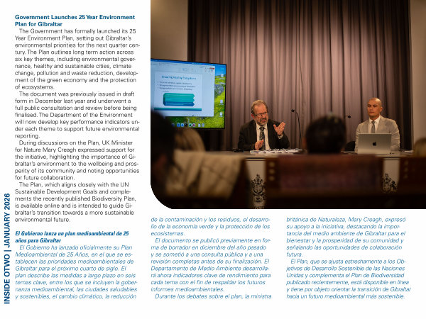 Government Launches 25 Year Environment Plan for Gibraltar The Government has formally launched its 25 Year Environment Plan, setting out Gibraltar’ s environmental priorities for the next quarter century. The Plan outlines long term action across six key themes, including environmental governance, healthy and sustainable cities, climate change, pollution and waste reduction, development of the green economy and the protection of ecosystems. The document was previously issued in draft form in December last year and underwent a full public consultation and review before being finalised. The Department of the Environment will now develop key performance indicators under each theme to support future environmental reporting. During discussions on the Plan, UK Minister for Nature Mary Creagh expressed support for the initiative, highlighting the importance of Gibraltar’ s environment to the wellbeing and prosperity of its community and noting opportunities for future collaboration. The Plan, which aligns closely with the UN Sustainable Development Goals and complements the recently published Biodiversity Plan, is available online and is intended to guide Gibraltar’ s transition towards a more sustainable environmental future.