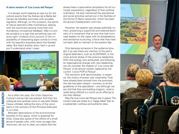 As is often the case, the Unión Deportiva Cultural Linense hall was packed. And then the colloquial and carefree voice of naturalist Rafael Cerpa unfolded, telling the story of the volunteers in the recovery of the Princesa Sofía park in La Línea. Between descriptions of the environmental benefits of this space, which is essential for birds, Cerpa also spoke of the efforts of a small group of people who, with more courage than resources, set out to clean up a place that has always been a speculative temptation for all municipal corporations, regardless of their political orientation. He also mentioned the educational and social activities carried out in the facilities of the former El Barco restaurant, which has been the group’ s headquarters until now.