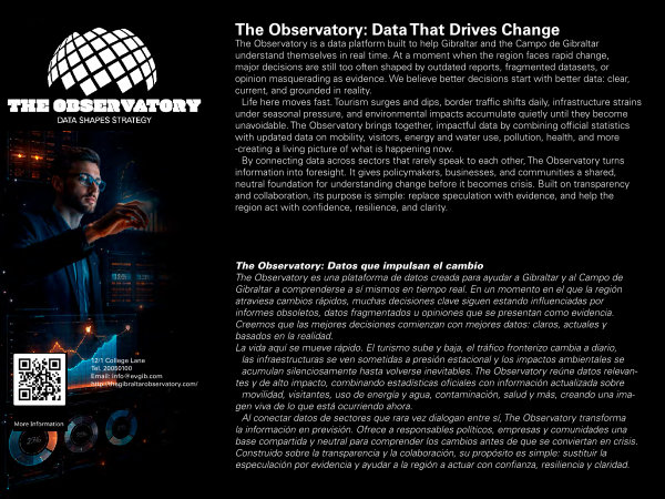 The Observatory is a data platform built to help Gibraltar and the Campo de Gibraltar understand themselves in real time. At a moment when the region faces rapid change, major decisions are still too often shaped by outdated reports, fragmented datasets, or opinion masquerading as evidence. We believe better decisions start with better data: clear, current, and grounded in reality. Life here moves fast. Tourism surges and dips, border traffic shifts daily, infrastructure strains under seasonal pressure, and environmental impacts accumulate quietly until they become unavoidable. The Observatory brings together, impactful data by combining official statistics with updated data on mobility, visitors, energy and water use, pollution, health, and more-creating a living picture of what is happening now. By connecting data across sectors that rarely speak to each other, The Observatory turns information into foresight. It gives policymakers, businesses, and communities a shared, neutral foundation for understanding change before it becomes crisis. Built on transparency and collaboration, its purpose is simple: replace speculation with evidence, and help the region act with confidence, resilience, and clarity.