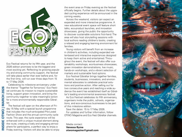 Eco Festival returns for its fifth year, and the 2026 edition promises to be the biggest and most exciting yet. Reflecting its growing popularity and strong community support, the festival will take place earlier than ever before and, for the first time, will run over three days from 15 to 17 May 2026. Celebrating its milestone anniversary under the theme“ Together for Tomorrow,” Eco Festival continues its mission to inspire sustainable living, support green innovation, and bring the community together to take meaningful action for a more environmentally responsible Gibraltar. The festival will open on the afternoon of Friday 15 May with a special launch programme that includes the much-anticipated Pre-Loved Fashion Show and the annual community cycle route. This year, the cycle experience will be enhanced with a unique musical element along the route, creating a lively and engaging atmosphere for participants, a perfect way to enjoy a Friday evening. Visitors will also be able to enjoy the event area on Friday evening as the festival officially begins. Further details about the upgraded cycling experience will be announced in the coming weeks. Across the weekend, visitors can expect an expanded and more interactive programme. A new educational event space will feature short talks, eco-product launches, and innovation showcases, giving the public the opportunity to discover sustainable solutions first-hand. The area will also host storytelling sessions with local authors reading children’ s books, creating a relaxed and engaging learning environment for families. Young visitors will benefit from an increase in children’ s activities, including expanded water-based and interactive experiences designed to keep them active and entertained. Throughout the event, the festival will also offer sustainability workshops, eco-business showcases, green innovation demonstrations, live music, hands-on workshops, and a vibrant selection of markets and sustainable food options. Eco Festival Gibraltar brings together families, students, businesses, innovators, and environmental advocates to celebrate practical solutions and positive action. After selling out for two consecutive years and reaching a wide audience the event has established itself as Gibraltar’ s leading environmental awareness festival. As Eco Festival celebrates its fifth anniversary, organisers invite the public, schools, organisations, and eco-conscious businesses to be part of this milestone edition. Save the dates: 15 to 17 May 2026. For updates and further information, follow OTWO Magazine and Eco Fest Gibraltar channels.