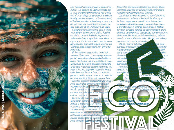 Eco Festival vuelve por quinto año consecutivo, y la edición de 2026 promete ser la más grande y emocionante hasta la fecha. Como reflejo de su creciente popularidad y del fuerte apoyo de la comunidad, el festival se celebrará antes que nunca y, por primera vez, tendrá una duración de tres días, del 15 al 17 de mayo de 2026. Celebrando su aniversario bajo el lema « Juntos por el mañana », el Eco Festival continúa con su misión de inspirar una vida sostenible, apoyar la innovación ecológica y unir a la comunidad para emprender acciones significativas en favor de un Gibraltar más responsable con el medio ambiente. El festival se inaugurará la tarde del viernes 15 de mayo con un programa especial que incluye el esperado desfile de moda Pre-Loved y la ruta ciclista comunitaria anual. Este año, la experiencia ciclista se verá mejorada con un elemento musical único a lo largo del recorrido, lo que creará un ambiente animado y atractivo para los participantes, una forma perfecta de disfrutar de la tarde del viernes. Los visitantes también podrán disfrutar de la zona del evento el viernes por la tarde, cuando comience oficialmente el festival. En las próximas semanas se darán a conocer más detalles sobre la experiencia ciclista mejorada. Durante el fin de semana, los visitantes podrán disfrutar de un programa más amplio e interactivo. Un nuevo espacio educativo acogerá charlas breves, lanzamientos de productos ecológicos y muestras de innovación, lo que dará al público la oportunidad de descubrir soluciones sostenibles de primera mano. La zona también acogerá sesiones de cuentacuentos con autores locales que leerán libros infantiles, creando un ambiente de aprendizaje relajado y atractivo para las familias. Los visitantes más jóvenes se beneficiarán de un aumento de las actividades infantiles, que incluyen experiencias acuáticas e interactivas ampliadas, diseñadas para mantenerlos activos y entretenidos. A lo largo del evento, el festival también ofrecerá talleres de sostenibilidad, exposiciones de empresas ecológicas, demostraciones de innovación verde, música en directo, talleres prácticos y una vibrante selección de mercados y opciones de comida sostenible. El Eco Festival Gibraltar reúne a familias, estudiantes, empresas, innovadores y defensores del medio ambiente para celebrar soluciones prácticas y acciones positivas. Tras agotar las entradas durante dos años consecutivos y alcanzar una amplia audiencia, el evento se ha consolidado como el principal festival de concienciación medioambiental de Gibraltar. Ahora que el Eco Festival celebra su quinto aniversario, los organizadores invitan al público, a las escuelas, a las organizaciones y a las empresas con conciencia ecológica a formar parte de esta edición tan señalada. Reserve las fechas: del 15 al 17 de mayo de 2026. Para obtener actualizaciones y más información, siga los canales de OTWO Magazine y Eco Fest Gibraltar.