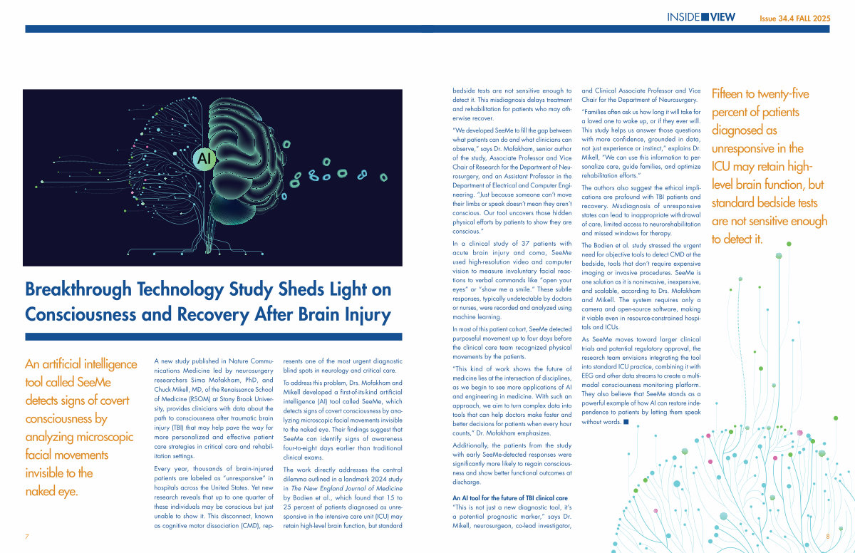To address this problem, Drs. Mofakham and Mikell developed a first-of-its-kind artificial intelligence( AI) tool called SeeMe, which detects signs of covert consciousness by analyzing microscopic facial movements invisible to the naked eye. Their findings suggest that SeeMe can identify signs of awareness four-to-eight days earlier than traditional clinical exams.