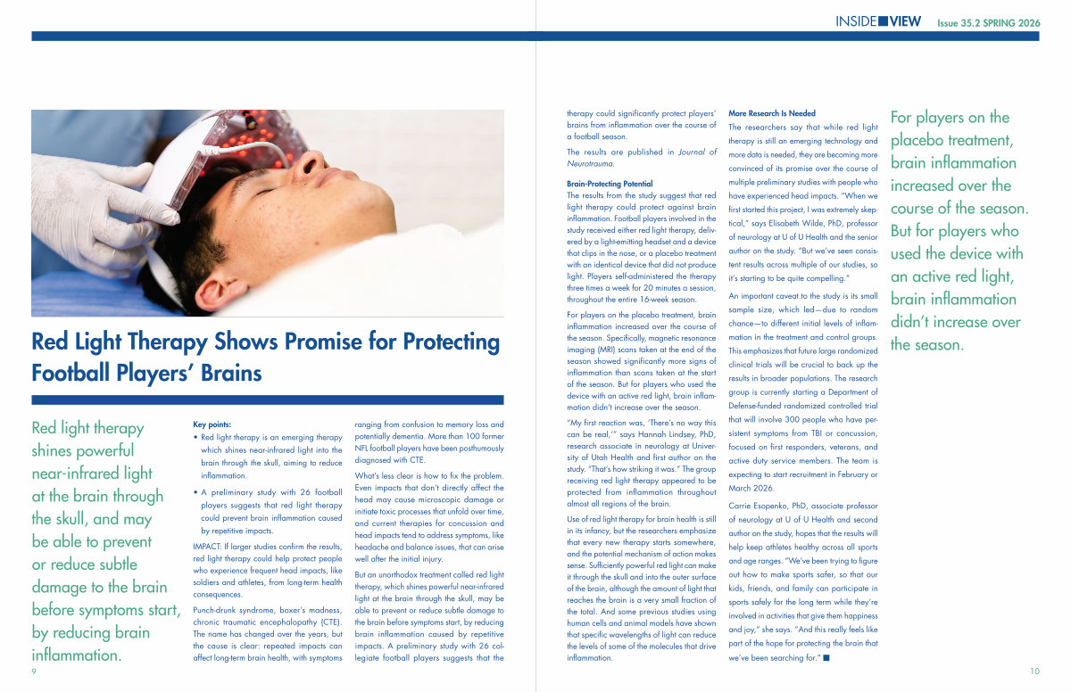 But an unorthodox treatment called red light therapy, which shines powerful near-infrared light at the brain through the skull, may be able to prevent or reduce subtle damage to the brain before symptoms start, by reducing brain inflammation caused by repetitive impacts. A preliminary study with 26 collegiate football players suggests that the