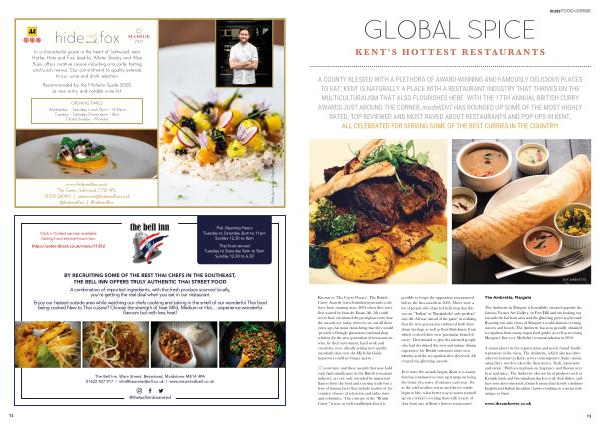 A COUNTY BLESSED WITH A PLETHORA OF AWARD-WINNING AND FAMOUSLY DELICIOUS PLACES TO EAT ; KENT IS NATURALLY A PLACE WITH A RESTAURANT INDUSTRY THAT THRIVES ON THE MULTICULTURALISM THAT ALSO FLOURISHES HERE . WITH THE 17TH ANNUAL BRITISH CURRY AWARDS JUST AROUND THE CORNER , insideKENT HAS ROUNDED UP SOME OF THE MOST HIGHLY RATED , TOP REVIEWED AND MOST RAVED ABOUT RESTAURANTS AND POP-UPS IN KENT , ALL CELEBRATED FOR SERVING SOME OF THE BEST CURRIES IN THE COUNTRY !