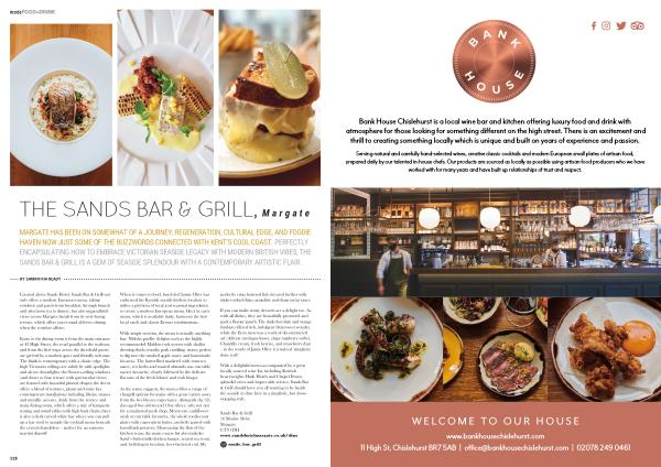 MARGATE HAS BEEN ON SOMEWHAT OF A JOURNEY ; REGENERATION , CULTURAL EDGE , AND FOODIE HAVEN NOW JUST SOME OF THE BUZZWORDS CONNECTED WITH KENT ’ S COOL COAST . PERFECTLY ENCAPSULATING HOW TO EMBRACE VICTORIAN SEASIDE LEGACY WITH MODERN BRITISH VIBES , THE SANDS BAR & GRILL IS A GEM OF SEASIDE SPLENDOUR WITH A CONTEMPORARY ARTISTIC FLAIR .