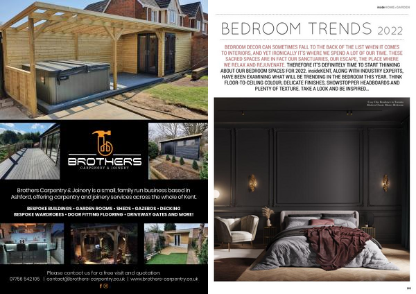 BEDROOM DECOR CAN SOMETIMES FALL TO THE BACK OF THE LIST WHEN IT COMES TO INTERIORS , AND YET IRONICALLY IT ’ S WHERE WE SPEND A LOT OF OUR TIME . THESE SACRED SPACES ARE IN FACT OUR SANCTUARIES , OUR ESCAPE , THE PLACE WHERE WE RELAX AND REJUVENATE . THEREFORE IT ’ S DEFINITELY TIME TO START THINKING ABOUT OUR BEDROOM SPACES FOR 2022 . insideKENT , ALONG WITH INDUSTRY EXPERTS , HAVE BEEN EXAMINING WHAT WILL BE TRENDING IN THE BEDROOM THIS YEAR . THINK FLOOR-TO-CEILING COLOUR , DELICATE FINISHES , SHOWSTOPPER HEADBOARDS AND PLENTY OF TEXTURE . TAKE A LOOK AND BE INSPIRED …
