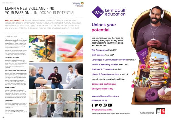 KENT ADULT EDUCATION PROVIDE A DIVERSE RANGE OF COURSES THAT ARE STARTING NOW ACROSS KENT , BRINGING OPPORTUNITIES FOR YOU TO DEVELOP A NEW TALENT , TAKE UP A CHALLENGE , AND ENHANCE YOUR WELLBEING . WHATEVER YOUR GOAL , KAE CAN GIVE YOU THE KEYS TO HELP YOU REACH YOUR POTENTIAL THROUGH AN ENJOYABLE AND REWARDING LEARNING EXPERIENCE .