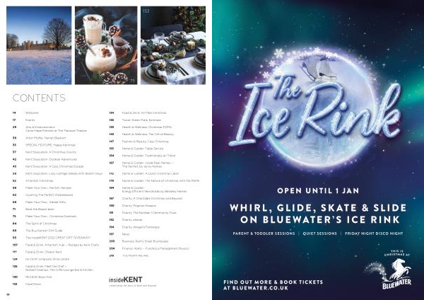 30 Artist Profile : Harriet Blaskett 35 SPECIAL FEATURE : Happy Kentmas ! 37 Kent Staycation : A Christmas County 42 Kent Staycation : Outdoor Adventures 45 Kent Staycation : A Cosy Christmas Escape 50 Kent Staycation : Cosy Cottage Breaks with Bloom Stays 52 A Kentish Christmas 58 Make Your Own … Kentish Hamper 62 Curating The Perfect Cheeseboard 66 Make Your Own … Edible Gifts 71 Beat the Board-dom ! 75 Make Your Own … Christmas Cocktails 84 The Spirit of Christmas 89 The Buy Kentish Gift Guide 95 The insideKENT 2022 GREAT GIFT GIVEAWAY ! 107 Food & Drink : A Kentish Yule – Recipes by Kent Chefs 117 Food & Drink : Cheers ! Kent 124 REVIEW : Simpsons Wine Estate