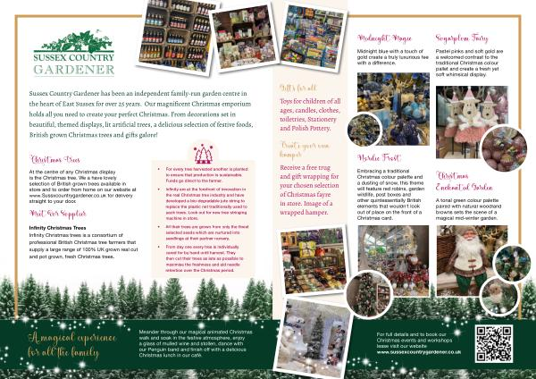 Sussex Country Gardener has been an independent family-run garden centre in the heart of East Sussex for over 25 years . Our magnificent Christmas emporium holds all you need to create your perfect Christmas . From decorations set in beautiful , themed displays , lit artificial trees , a delicious selection of festive foods , British grown Christmas trees and gifts galore !