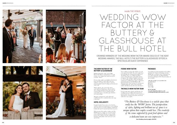 CROWNED WINNERS OF THE WEDDING WOW FACTOR AWARD 2022 / 23 AT THE KENT WEDDING AWARDS , THE BULL HOTEL ’ S THE BUTTERY & GLASSHOUSE OFFERS A SPECTACULAR GUEST EXPERIENCE