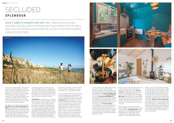 When envisioning a landscape that embodies quintessential Kent , most would imagine something as picture-perfect as The High Weald . Another designated Area of Outstanding Natural Beauty , this Kentish treasure represents the county ’ s countryside at its most idyllic . This medieval landscape of wooded , rolling hills studded with sandstone outcrops , small , irregular-shaped fields , scattered farmsteads , and ancient routeways makes for so much to take in , admire and explore with all its patchwork charm and endearing character full of enthralling originality and extraordinary beauty . An area with such vast countryside and winding roads that lead adventurers into peacefully pastoral surroundings , secluded splendour can very much be achieved here . Wilderness Bed and Breakfast ( www . wildernessbandb . co . uk ) is a true example of this . Nestled right in the heart of the Weald of Kent itself , this bed and breakfast on rambling grounds adorned with beautiful old buildings and orchards offers self distancing and privacy during your stay . Operating via a self check-in with breakfast being served in your own self-contained area , this is ‘ wilderness ’ at its best : a secluded bliss .