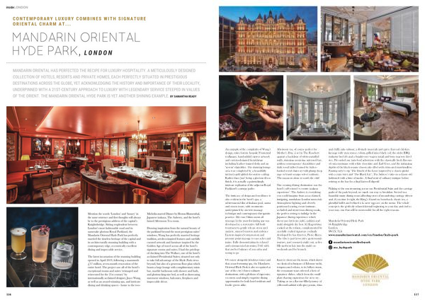 MANDARIN ORIENTAL HAS PERFECTED THE RECIPE FOR LUXURY HOSPITALITY . A METICULOUSLY DESIGNED COLLECTION OF HOTELS , RESORTS AND PRIVATE HOMES , EACH PERFECTLY SITUATED IN PRESTIGIOUS DESTINATIONS ACROSS THE GLOBE , YET ACKNOWLEDGING THE HISTORY AND IMPORTANCE OF THEIR LOCALITY , UNDERPINNED WITH A 21ST-CENTURY APPROACH TO LUXURY WITH LEGENDARY SERVICE STEEPED IN VALUES OF THE ORIENT . THE MANDARIN ORIENTAL HYDE PARK IS YET ANOTHER SHINING EXAMPLE . BY SAMANTHA READY