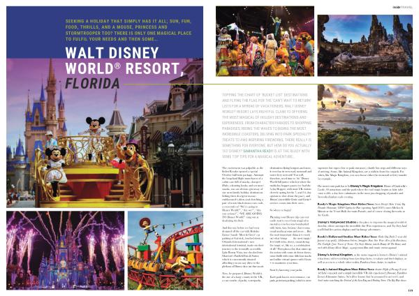 TOPPING THE CHART OF ‘ BUCKET LIST ’ DESTINATIONS AND FLYING THE FLAG FOR THE ‘ CAN ’ T-WAIT-TO-RETURN ’ LISTS FOR A MYRIAD OF VACATIONERS , WALT DISNEY WORLD ® RESORT LAYS RIGHTFUL CLAIM TO OFFERING THE MOST MAGICAL OF HOLIDAY DESTINATIONS AND EXPERIENCES . FROM CHARACTER PARADES TO SHOPPING PARADISES , RIDING THE WAVES TO RIDING THE MOST INCREDIBLE COASTERS , DELVING INTO PARK SPECIALITY TREATS TO AWE-INSPIRING FIREWORKS , THERE REALLY IS SOMETHING FOR EVERYONE . BUT HOW DO YOU ACTUALLY ‘ DO ’ DISNEY ? SAMANTHA READY IS AT THE READY WITH SOME TOP TIPS FOR A MAGICAL ADVENTURE …