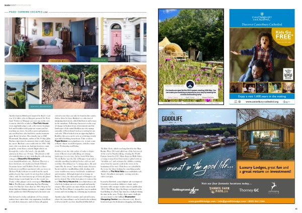 Another famous British poet inspired by Kent ’ s coast was T . S , Elliot , who in Margate penned The Waste Land . Visitors to Margate can now stay in the very rooms in which he resided at The Pink House ( www . dogfriendlycottages . co . uk ), a five-storey boutique bed and breakfast with gorgeous rooms and farreaching sea views . As well as poets and painters , spy novelists have also had their eureka moments upon Kent ’ s beaches . On a family stay at Cliff Promenade , Broadstairs , author of The 39 Steps , John Buchan experienced a moment that would change his career . Buchan ’ s son would write in 1990 : “ My sister , who was about six , had just learnt to count properly , went down a nearby flight which cut through the rock to the beach - she gleefully announced ; there are 39 steps .” Broadstairs is full of wonderful places to stay , including the self-catering cottages of Beautiful Broadstairs ( www . beautifulbroadstairs . com ). Harbour Haven is a three-bedroom , two-bathroom Grade II listed Georgian house and Nickleby Nook is a threebedroom second-floor apartment with sea views on Dickens Walk , both just seconds from the sandy golden beach . Spy novels do not stop there in Kent either , with the most famous spy of them all , James Bond , being created right here in the county too . Today a blue plaque can be seen upon The Duck Inn at Pett Bottom confirming that Ian Fleming wrote You Only Live Twice there in 1964 . Stop by for divine high-end dining experiences , or simply a drink in the garden in which Fleming had a favourite seat .