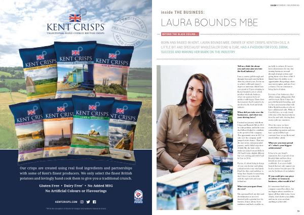 BORN AND RAISED IN KENT , LAURA BOUNDS MBE , OWNER OF KENT CRISPS , KENTISH OILS , A LITTLE BIT AND SPECIALIST WHOLESALER CURD & CURE , HAS A PASSION FOR FOOD , DRINK , SUCCESS AND MAKING HER MARK ON THE INDUSTRY .