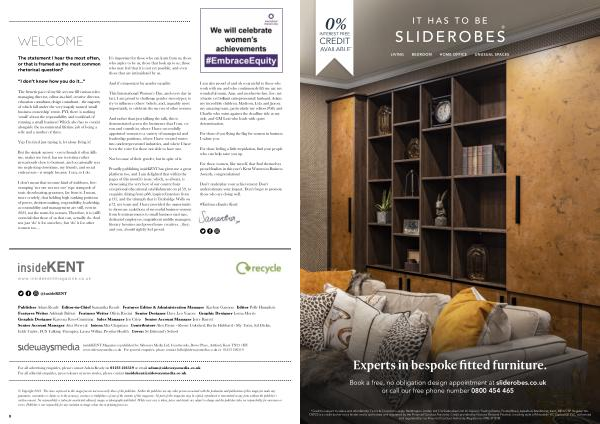 insideKENT Magazine is published by Sideways Media Ltd , Coachworks , Dover Place , Ashford , Kent TN23 1HU www . sidewaysmedia . co . uk For general enquiries , please contact hello @ sidewaysmedia . co . uk or 01233 226519