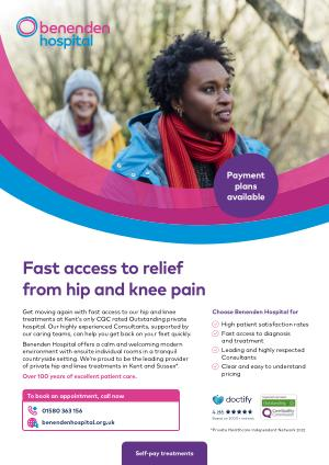Benenden Hospital offers a calm and welcoming modern environment with ensuite individual rooms in a tranquil countryside setting . We ’ re proud to be the leading provider of private hip and knee treatments in Kent and Sussex *.
