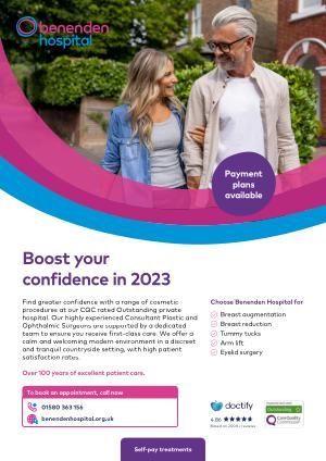 Find greater confidence with a range of cosmetic procedures at our CQC rated Outstanding private hospital . Our highly experienced Consultant Plastic and Ophthalmic Surgeons are supported by a dedicated team to ensure you receive first-class care . We offer a calm and welcoming modern environment in a discreet and tranquil countryside setting , with high patient satisfaction rates .