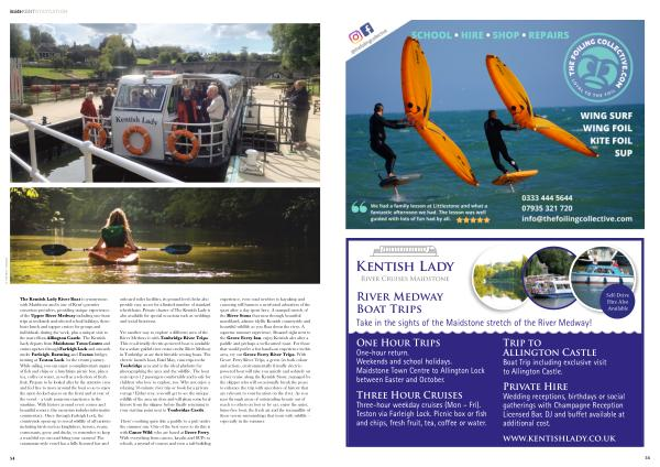 The Kentish Lady River Boat is synonymous with Maidstone and is one of Kent ’ s premier excursion providers , providing unique experiences of the Upper River Medway including one-hour trips at weekends and selected school holidays , threehour lunch and supper cruises for groups and individuals during the week , plus a unique visit to the marvellous Allington Castle . The Kentish Lady departs from Maidstone Town Centre and cruises upriver through Farleigh Lock and onwards under Farleigh , Barming and Teston bridges , turning at Teston Lock for the return journey . While sailing , you can enjoy a complimentary supper of fish and chips or a lunchtime picnic box , plus a tea , coffee or water , as well as a selection of fresh fruit . Prepare to be looked after by the attentive crew and feel free to move around the boat so as to enjoy the open decked spaces on the front and at rear of the vessel – a truly gorgeous experience in the sunshine . With history around every corner and beautiful scenery , this excursion includes informative commentary . Once through Farleigh Lock , the countryside opens up to reveal wildlife of all varieties including birds such as kingfishers , herons , swans , cormorants , geese and ducks , so remember to keep a watchful eye out and bring your camera ! The catamaran-style vessel has a fully licensed bar and onboard toilet facilities , its ground level decks also provide easy access for a limited number of standard wheelchairs . Private charter of The Kentish Lady is also available for special occasions such as weddings and social functions .
