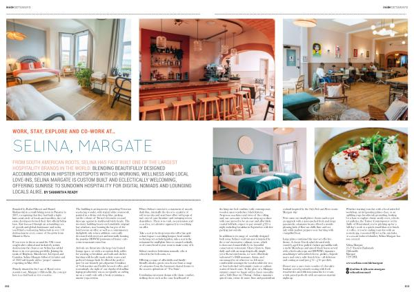 In addition to its range of carefully designed bedrooms , Selina ’ s seafront spot is inspired by the town ’ s innovative culinary scene , which is showcased masterfully by its beautiful conservatory restaurant . Open 12pm to 10pm daily and with an unapologetically simple yet well-executed menu , we were effortlessly welcomed by F & B manager , Annie , and encouraged to sit wherever we felt most comfortable amongst the wooden tables for two or four bedecked with simple chairs or cushion scattered bench seats . To the glow of a Margate summer sunset we began with a classic mescalita and a ‘ Jolly Boys ( sic ) Outing ’, Selina ’ s signature spiced rum , crème de mure , lime and passionfruit cocktail inspired by the Only Fools and Horses iconic Margate trip !