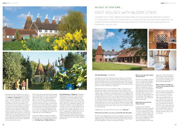 THE PERFECT WAY TO TRULY EMBRACE THE UNIQUE APPEAL OF AN OAST HOUSE AND EXPERIENCE THE BEAUTY OF THE BUILDING UP CLOSE IS BY STAYING IN ONE . ALL LOVINGLY RESTORED AND CARED FOR BY OWNERS WITH AN APPRECIATION FOR THEIR PROPERTY ’ S HERITAGE , BLOOM STAY ’ S PORTFOLIO OF OAST HOUSES PROVIDES THE OPPORTUNITY TO DO JUST THIS .