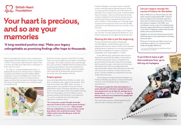 Gifts in Wills from our donors fund over half of the research supported by BHF , research that has helped lower UK death rates from heart and circulatory diseases by 75 % since the charity ’ s inception in the 1960s . Your contribution can be a part of something huge , leaving a legacy that will be an essential cog in the wheel of fighting conditions like lacunar strokes and vascular dementia .
