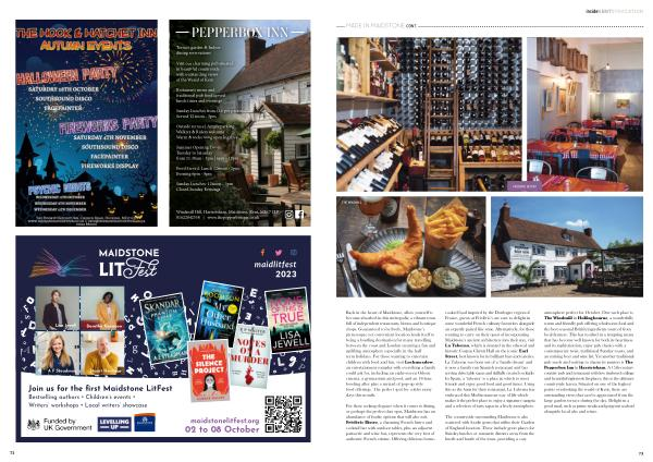 The countryside surrounding Maidstone is also scattered with foodie gems that utilise their Garden of England location . These include great places for Sunday lunches or romantic dinners away from the hustle and bustle of the town , providing a cosy atmosphere perfect for October . One such place is The Windmill in Hollingbourne , a wonderfully warm and friendly pub offering wholesome food and the best seasonal British ingredients sourced from local farmers . This has resulted in a tempting menu that has become well known for both its heartiness and its sophistication ; enjoy pub classics with a contemporary twist , traditional Sunday roasts , and an enticing beer and wine list . Yet another traditional pub ready and waiting to charm its punters is The Pepperbox Inn in Harrietsham . A 15th-century country pub and restaurant with low timbered ceilings and beautiful inglenook fireplaces , this is the ultimate countryside haven . Situated on one of the highest points overlooking the weald of Kent , there are outstanding views that can be appreciated from the large garden terrace during the day . Delight in a good meal , such as prime steaks and gorgeous seafood alongside local ales and wines .