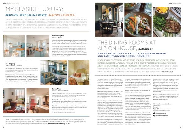 AIMING TO ENSURE THAT YOU FIND THE BEST HOLIDAY LET IN THE AREA , MY SEASIDE LUXURY ’ S PROPERTIES ARE IN THE BEST SEA-VIEW LOCATIONS THE REGION HAS TO OFFER ; BOASTING CHOICES FROM COSY ESCAPES FOR TWO TO REGENCY SPLENDOUR TOWNHOUSES FOR MULTI-GEN STAYCATIONING , THE PROPERTIES OFFER A UNIQUE BOLTHOLE TO EXPLORE THANET ’ S ROYAL HARBOURSIDE GEM , RAMSGATE .