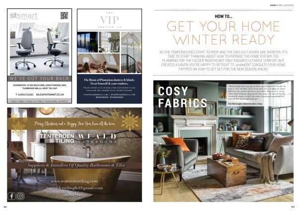 AS THE TEMPERATURES START TO DROP AND THE DAYLIGHT HOURS ARE SHORTER , IT ’ S TIME TO START THINKING ABOUT HOW TO PREPARE THE HOME FOR WINTER . PLANNING FOR THE COLDER MONTHS NOT ONLY ENSURES ULTIMATE COMFORT BUT CREATES A HAVEN YOU ’ RE HAPPY TO RETREAT TO . insideKENT CONSULTS FOUR HOME EXPERTS ON HOW TO GET SET FOR THE NEW SEASON AHEAD .