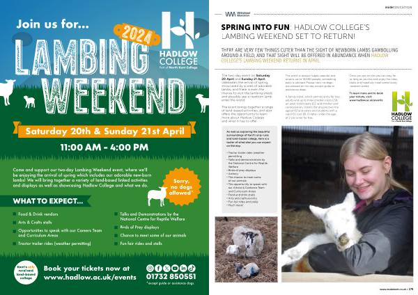 Come and support our two-day Lambing Weekend event , where we ' ll be enjoying the arrival of spring which includes our adorable new-born lambs ! We will bring together a variety of land-based linked activities and displays as well as showcasing Hadlow College and what we do .
