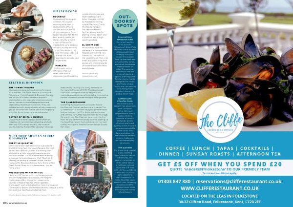 FOLKESTONE HARBOUR ARM Very much worthy of its acclaim , Folkestone ’ s beautifully restored harbour offers all you could need to enjoy a day out beside the seaside . Soak up the fresh sea air and pretty views , and relish the diverse entertainment on offer . This summer season will see the return of daytime sports showings and family cinema nights alongside live music and many unique foodie pop-ups serving everything from decadent desserts to global street food .
