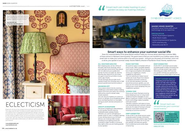 Smart ways to enhance your summer social life Does the unpredictability of the great British weather make you nervous about planning a summer BBQ , al fresco dinner or Olympics viewing party ? The good news is that you can transform your outdoor space using smart tech to make your summer plans a hit with your guests – and give you the peace of mind that , come rain or shine , your garden is summer ready . Charlie Hibbins , director of Symbiotic Smart Homes , explains how .