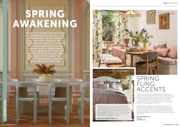 SPRING INTO ACTION THIS APRIL AND EXPLORE SOME REFRESHING SPRUCE-UPS FOR A LITTLE SPRING AWAKENING – BECAUSE THERE’ S NO BETTER TIME TO WAVE GOODBYE TO THE COLD AND EMBRACE THE VIBRANCY OF THE SEASON IN OUR HOMES. FROM A FRESH COAT AND A FEW NEW ACCENTS TO INDOOR JUNGLES, A LITTLE ILLUMINATION AND A GOOD OLD- FASHIONED DECLUTTER, insideKENT, ALONG WITH INDUSTRY EXPERTS, BRINGS YOU THE TOP TIPS ON REJUVENATING, REVIVING AND REFRESHING FOR THE YEAR AHEAD. inSPIRATION