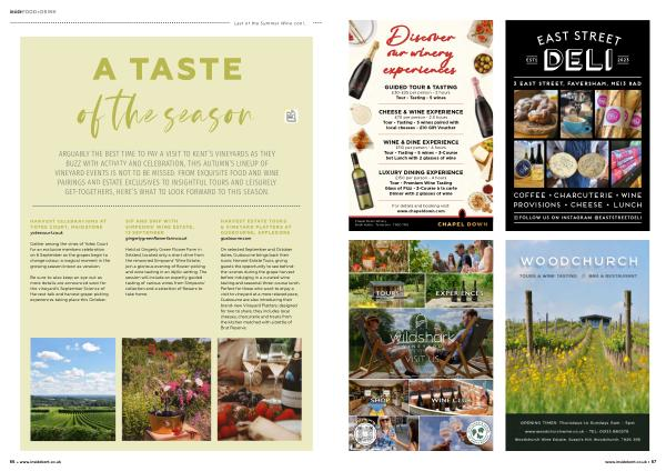 A TASTE of the season ARGUABLY THE BEST TIME TO PAY A VISIT TO KENT’ S VINEYARDS AS THEY BUZZ WITH ACTIVITY AND CELEBRATION, THIS AUTUMN’ S LINEUP OF VINEYARD EVENTS IS NOT TO BE MISSED. FROM EXQUISITE FOOD AND WINE PAIRINGS AND ESTATE EXCLUSIVES TO INSIGHTFUL TOURS AND LEISURELY GET-TOGETHERS, HERE’ S WHAT TO LOOK FORWARD TO THIS SEASON.