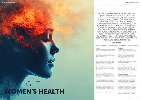 FOR DECADES, WOMEN’ S UNIQUE HEALTH NEEDS HAVE BEEN SQUEEZED INTO A ONE-SIZE-FITS-ALL MODEL THAT OFTEN DOESN’ T FIT AT ALL. NOW, HOWEVER, THANKS TO A MIXTURE OF PUBLIC DEMAND, GOVERNMENT STRATEGY AND TIRELESS CAMPAIGNING, THE SPOTLIGHT IS SHIFTING. THE LATEST 10-YEAR WOMEN’ S HEALTH STRATEGY FOR ENGLAND( PUBLISHED IN AUGUST 2022) SETS OUT A VISION THAT IS AMBITIOUS, WIDE- REACHING AND LONG OVERDUE. IT FOCUSES ON ISSUES THAT AFFECT EVERY STAGE OF A WOMAN’ S LIFE, FROM MENSTRUAL HEALTH TO MENOPAUSE AND MENTAL WELLBEING, WHILE ALSO TACKLING THE STUBBORN INEQUALITIES THAT LEAVE SOME WOMEN MUCH WORSE OFF THAN OTHERS. SO, WHAT DOES THAT LOOK LIKE IN REAL LIFE? AND PERHAPS MORE IMPORTANTLY, HOW DO WE MAKE SURE THE MOMENTUM ISN’ T LOST?
