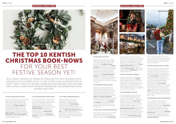 Plan to escape the festive hustle and bustle and cosy up in one of Kent’ s warmest boltholes. If a home-from-home hideaway is calling your name, Bloom Stays’( bloomstays. com) characterful coastal, city and countryside getaways make for an excellent choice. If you’ re craving pure splendour and luxury comforts, Champneys Eastwell Manor’ s( champneys. com / hotels) roaring fires, rich interiors and splendid spa facilities offer a delightful setting for a Christmas Spa Break. www. insidekent. co. uk • 51