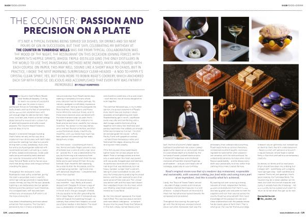 IT’ S NOT A TYPICAL EVENING BEING SERVED SIX DISHES, SIX DRINKS AND SIX NEAT POURS OF GIN IN SUCCESSION, BUT THAT SAID, CELEBRATING MY BIRTHDAY AT THE COUNTER IN TUNBRIDGE WELLS WAS FAR FROM TYPICAL. COLLABORATION WAS THE MOOD OF THE NIGHT, THE RESTAURANT ON THIS OCCASION JOINING FORCES WITH MORPETH’ S HEPPLE SPIRITS, WHOSE TRIPLE-DISTILLED GINS( THE ONLY DISTILLERS IN THE WORLD TO USE THIS PAINSTAKING METHOD) WERE PAIRED, MIXED AND POURED WITH EACH COURSE. ON PAPER, THIS MAY WELL SOUND LIKE A SHORT WALK TO CHAOS, BUT IN PRACTICE, I WOKE THE NEXT MORNING SURPRISINGLY CLEAR-HEADED- A NOD TO HEPPLE’ S CRYSTAL-CLEAN SPIRIT, YES, BUT EVEN MORE TO ROBIN READ’ S COOKERY, WHICH ANCHORED EACH SIP WITH FOOD SO DELICIOUS AND ACCOMPLISHED THAT EVERY BITE WAS ENTIRELY MEMORABLE. BY POLLY HUMPHRIS