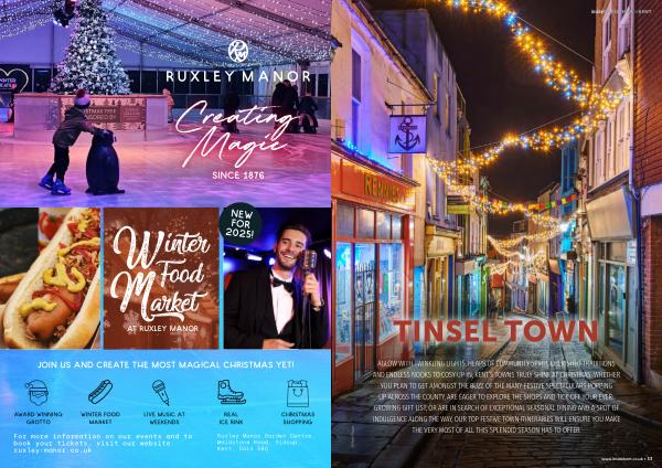 AGLOW WITH TWINKLING LIGHTS, HEAPS OF COMMUNITY SPIRIT, CHERISHED TRADITIONS AND ENDLESS NOOKS TO COSY UP IN, KENT’ S TOWNS TRULY SHINE AT CHRISTMAS. WHETHER YOU PLAN TO GET AMONGST THE BUZZ OF THE MANY FESTIVE SPECTACULARS POPPING UP ACROSS THE COUNTY, ARE EAGER TO EXPLORE THE SHOPS AND TICK OFF YOUR EVER- GROWING GIFT LIST, OR ARE IN SEARCH OF EXCEPTIONAL SEASONAL DINING AND A SPOT OF INDULGENCE ALONG THE WAY, OUR TOP FESTIVE TOWN ITINERARIES WILL ENSURE YOU MAKE THE VERY MOST OF ALL THIS SPLENDID SEASON HAS TO OFFER. www. insidekent. co. uk • 33
