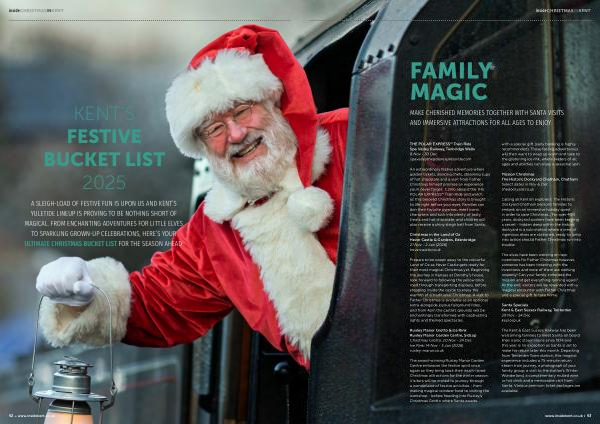 The Kent & East Sussex Railway has been welcoming families to meet Santa on board their iconic steam trains since 1974 and this year is no exception as Santa is set to make his return later this month. Departing from Tenterden Town station, this magical experience includes a 75-minute return steam train journey, a photograph of your family group, a visit to the station’ s Winter Wonderland, a complimentary mulled wine or hot drink and a memorable visit from Santa. Various premium ticket packages are available. www. insidekent. co. uk • 43