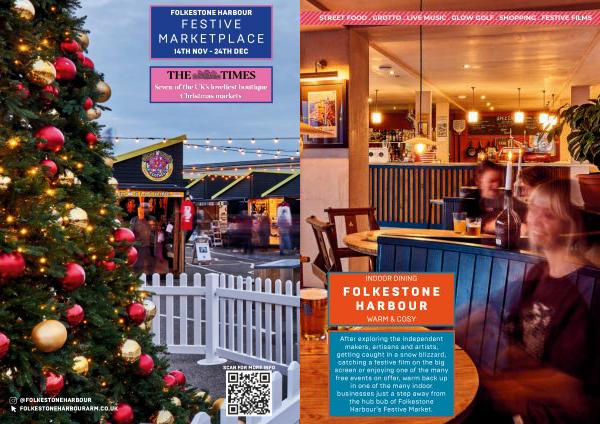 After exploring the independent makers, artisans and artists, getting caught in a snow blizzard, catching a festive film on the big screen or enjoying one of the many free events on offer, warm back up in one of the many indoor businesses just a step away from the hub bub of Folkestone Harbour’ s Festive Market. www. insidekent. co. uk • 7