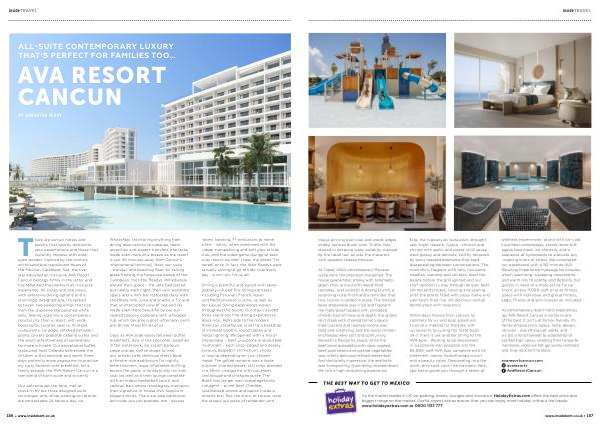 There are certain hotels and resorts that quietly dismantle your expectations and those that instantly impress with wideeyed wonder. Inspired by the pristine white sand and translucent blues of the Mexican Caribbean Sea, the fivestar elevated all-inclusive AVA Resort Cancun belongs firmly in the latter and has redefined the premium all-inclusive experience. All suites and sea views, with extensive dining options and a stunningly designed spa, it’ s spread between two sweeping wings that rise from the shoreline like polished white sails, feeling more like a contemporary coastal city than a resort, with wide boulevards, curated spaces, multiple restaurants, six pools stitched between palms, private poolside cabana suites and the warm attentiveness of somewhere far more intimate. Our exceptional buffet restaurant host Orlando befriended the children within seconds and spent three days patiently encouraging me to practise my rusty Spanish over breakfast; for a family escape, the AVA Resort Cancun is a rare blend of both scale and sincerity.